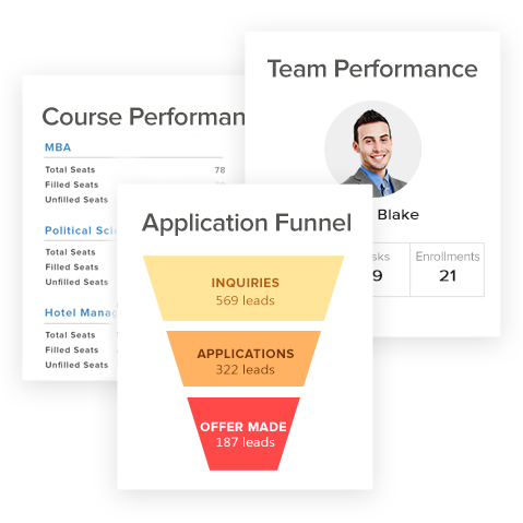 Track all your marketing, course, and admissions team performance. Get complete insights into the performance of your teams, your courses, campuses etc.